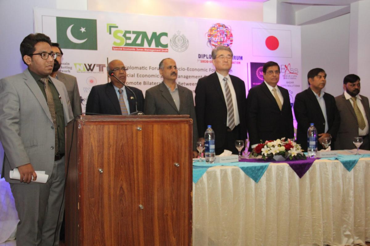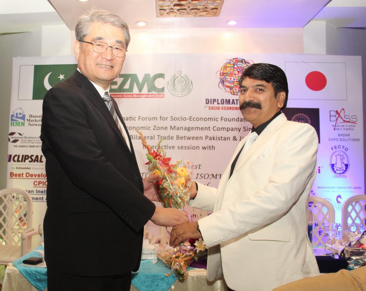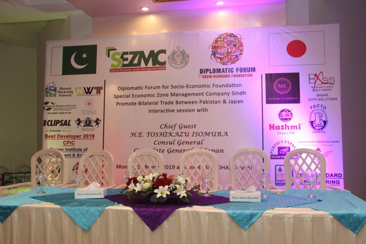 Diplomatic Forum organized an interactive session to promote bilateral trade between Pakistan and Japan with H.E. TOSHIKAZU ISOMURA, Consul General, Consulate General of the Japan in Karachi on 11th March, 2019 at DHA Sunset Club, Karachi in collaboration with Special Economic Zone Management Company, Investment Department, Government of Sindh. Mr. Abdul Azeem Uqaili, Chief Executive, SEZMC also consented to be the Guest of Honor for this ceremony. He promoted the SEZMC and other related projects of Investment Department, Government of Sindh. During his speech he said,